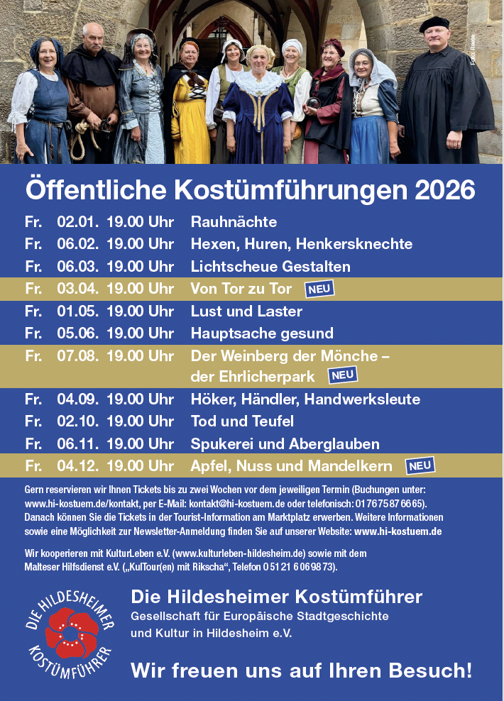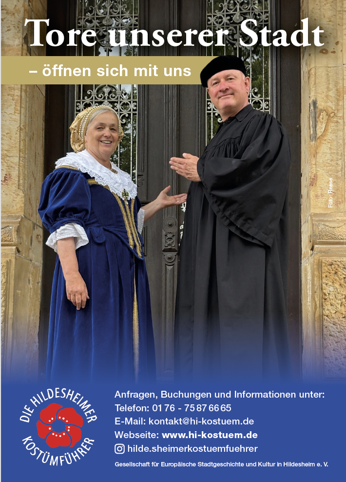Gern nehmen wir Sie mit auf unsere einzigartigen Zeitreisen in die 1200-jährige Geschichte der Stadt. Tief tauchen Sie mit unseren gewandeten Stadtführer*Innen in längst vergangene Zeiten ein. Historische Persönlichkeiten berichten kenntnisreich und zugleich unterhaltsam über ihr Leben und lassen Sie so das Besondere der jeweiligen Jahrhunderte spüren. Seit über 20 Jahren machen wir so die Geschichte der Stadt Hildesheim hautnah erlebbar.